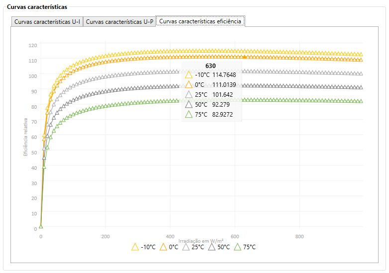 • O fabricante cadastra na base de dados do PV*SOL ainda o rendimento sob baixa irradiação (normalmente 200 ou 300 W/m²) e os coeficientes de temperatura para corrente, tensão e potência;