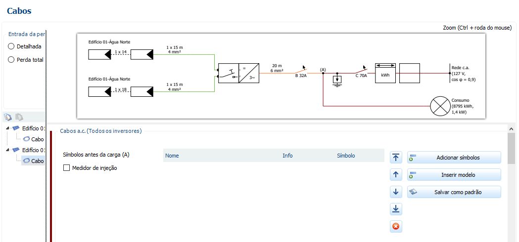 A coluna à direita apresenta o resumo do projeto em elaboração, onde foram incluidos totais de potência dos módulos e do inversor e o fator de dimensionamento